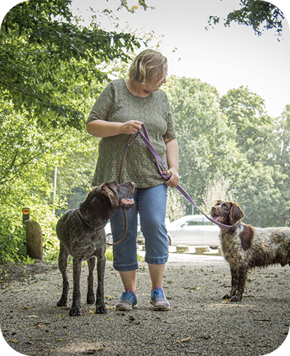 Angela kijkt altijd eerst of je hond goed past in de groep. Soms starten we met een paar individuele wandelingen.